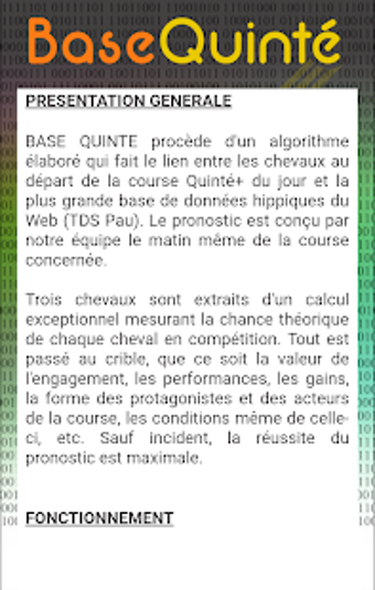 يتطلب Base Quinté أندرويد 9.0 وما فوق. الإصدار الحالي من التطبيق هو 1.0 ، ولا يمكنك تشغيله إلا باللغة الفرنسية.